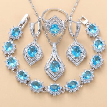 4-Piece Women’s Jewelry Set: Necklace, Earrings, Ring, and Pendant, Mixed Stones, Available in Red, Rainbow, and Ocean Blue Colors.